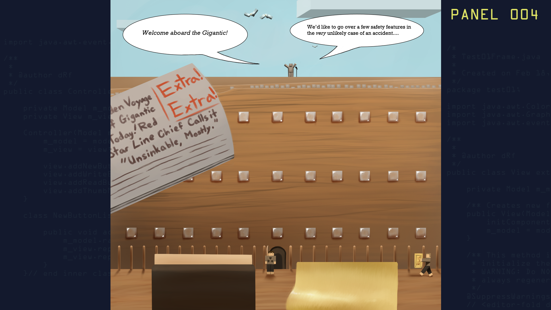 The Gigantic - Mary and Dad find themselves on the cruise "The Gigantic", courtesy of Redstone Weapons Laboratory. They escape the ship and make it shore when it sinks "100 miles off the coast of the middle of nowhere" just prior to the start of the first episode. See the graphic novel prequel for more information. While the ship does not appear in a any full-length episodes, it is featured in MADMA Short Film #2.